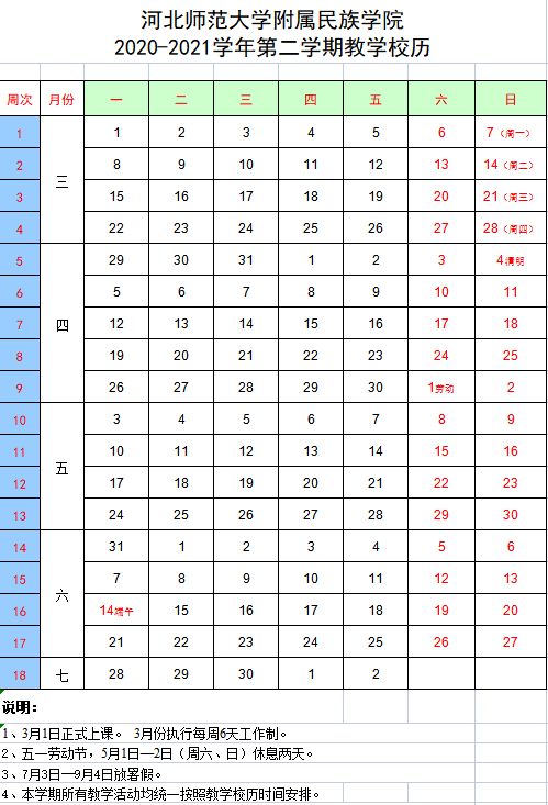 2020-2021第二学期校历