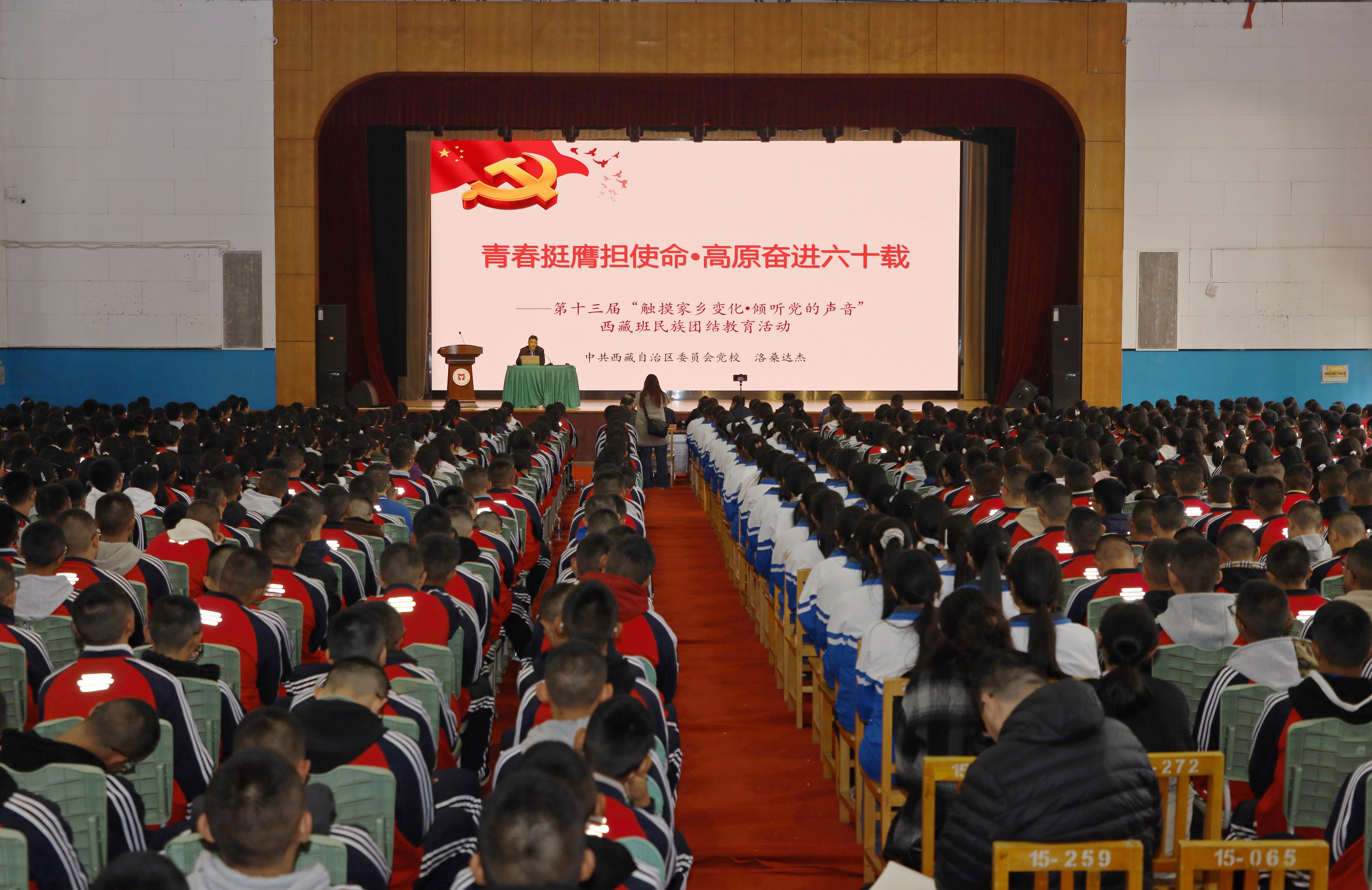 西藏自治区党委党校副教授洛桑达杰、西藏职业技术学院副教授黄秋霞、山南市隆子县玉麦乡人民政府干部次仁仓决分别以党课、团课和分享成长经历的形式,围绕“青春挺膺担使命·高原奋进六十载”的主题进行宣讲。宣讲结合习近平总书记给西藏各族干部群众的系列重要回信精神和“老西藏精神”,系统阐述了在党中央坚强领导下西藏自治区成立60年来取得的辉煌发展成就,以及习近平总书记对西藏各族人民群众的亲切关怀,深入分析了民族团结对于西藏社会稳定和长治久安的重要意义,详细解读了中央各项惠民政策在雪域高原的落地成效,并鼓励同学们增进交流互鉴,促进团结进步。学生在听完报告后深受鼓舞,齐声高喊:“请党放心,强国有我!”“请党放心,兴藏有我!”“请党放心,固边有我!”表达决心。白少双在总结中希望全体西藏班学生珍惜在内地学习的宝贵机会,刻苦钻研文化知识,不断铸牢中华民族共同体意识,坚定“感党恩、听党话、跟党走”的信念,以青春力量积极投身于团结富裕文明和谐美丽的社会主义现代化新西藏建设。